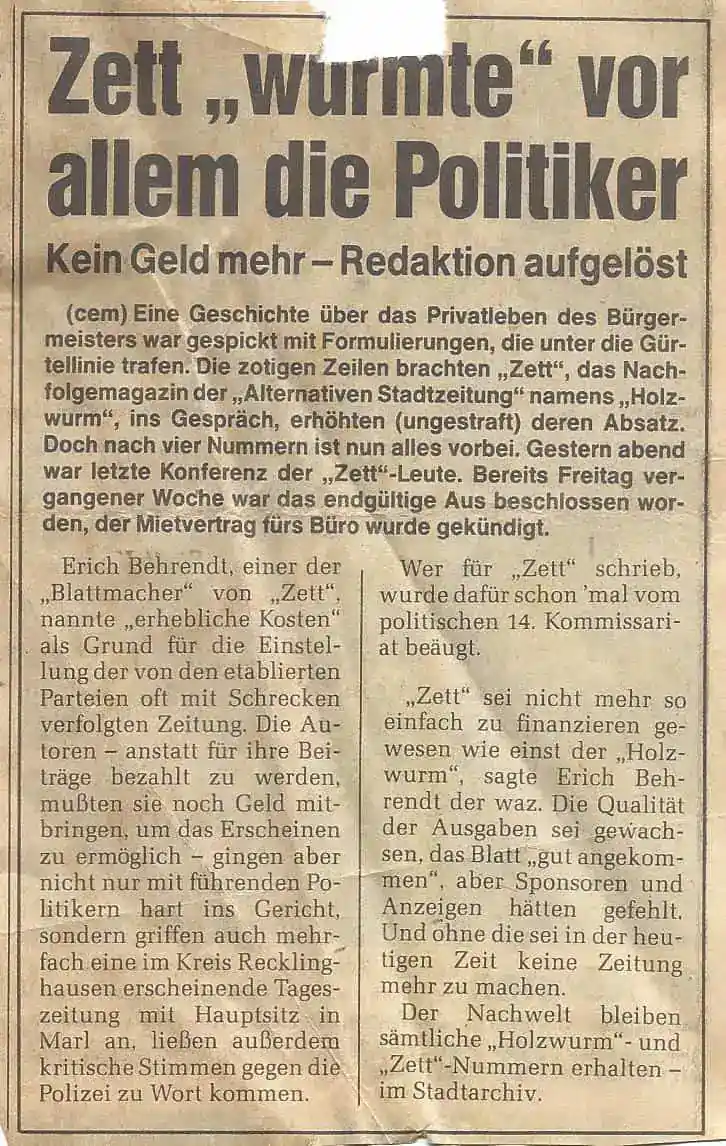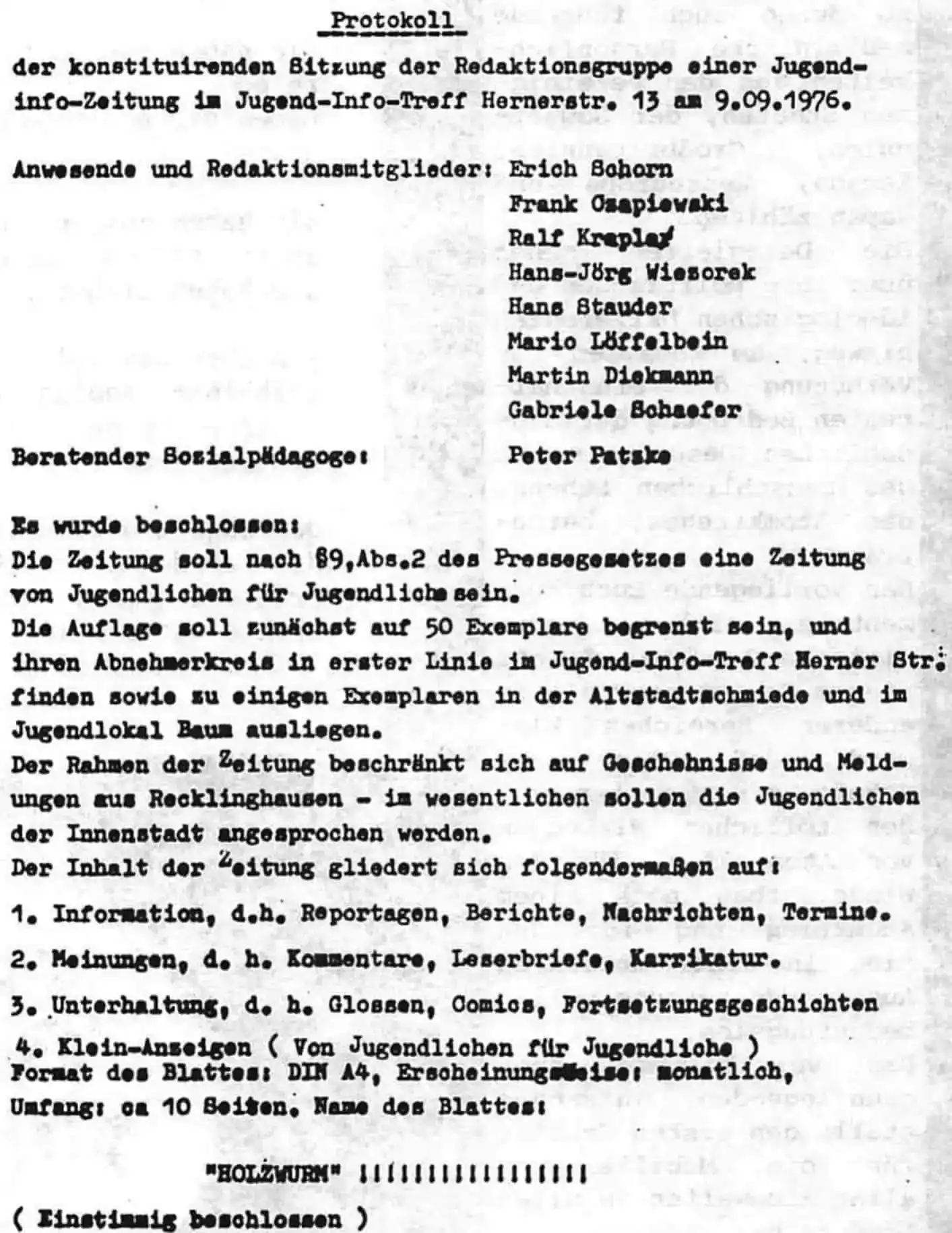 Der HOLZWURM wurde 1976 in Recklinghausen als Jugendzeitschrift gegründet, 1989 als Stattzeitschrift aufgelöst und ist seit 2022 wieder online präsent.