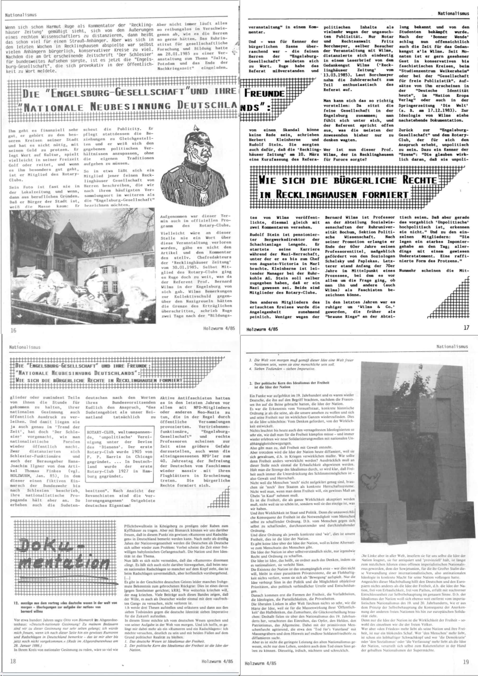 Unvergessen ist uns sein Leserbrief in der Recklinghäuser Zeitung aus dem Jahr1985. Am 28.1.1985 hatte die „Engelsburg-Gesellschaft“ (Rotarier u. a.) zu einem Vortrag des rechtsnationalistischen Politikwissenschaftlers Bernhard Wilms eingeladen. Seine Ausführungen zur „Nationalen Neubesinnung Deutschland“ gingen einigen dann doch zu weit. Es folgte eine öffentliche Debatte in der Recklinghäuser Zeitung, in der Borchmeyer sich ausdrücklich in einem Leserbrief von diesem Gedankengut distanzierte und die Reaktion vieler Teilnehmend auf den Vortrag kritisierte. (Ein ausführlicher Bericht findet sich in der Ausgabe 1985/4, S. 16 ff. des Holzwurm.)